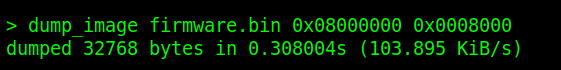 This command dumps the contents from 0x08000000 to firmware.bin with a size of 512 KB.