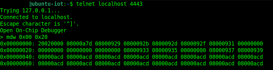 Once connected via Telnet, one of the first things to test is whether we can read the memory from the device. Use the mdw (memory display word) command to read memory